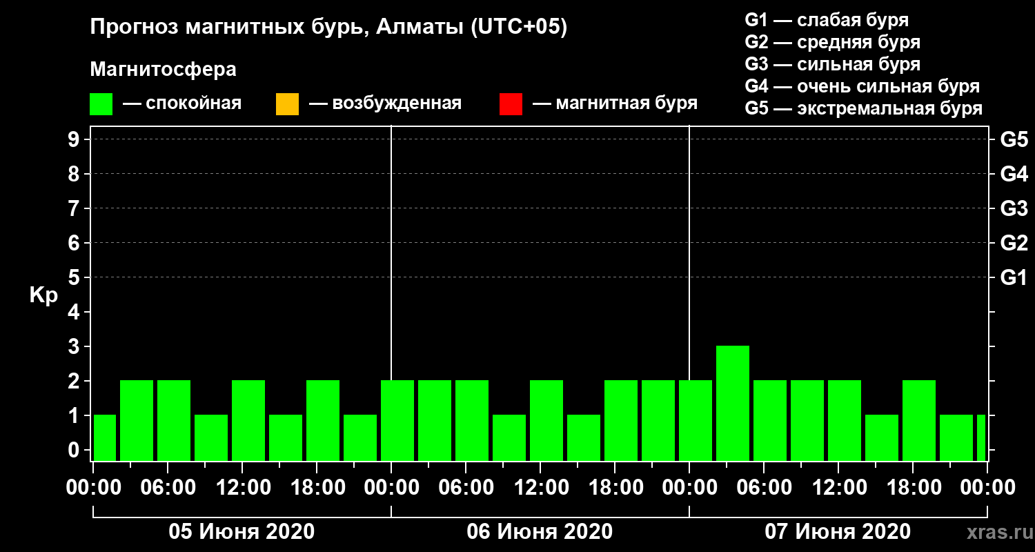 Прогноз магнитных бурь Алматы на 5 июня 2020 года