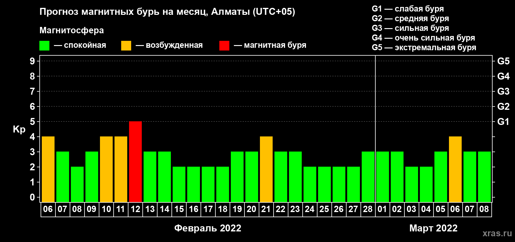Прогноз магнитных бурь Алматы на 6 февраля 2022 года