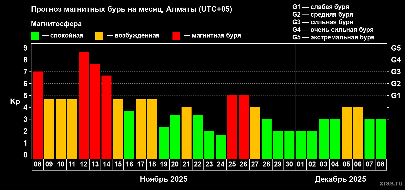 Прогноз магнитных бурь Алматы на 8 ноября 2025 года