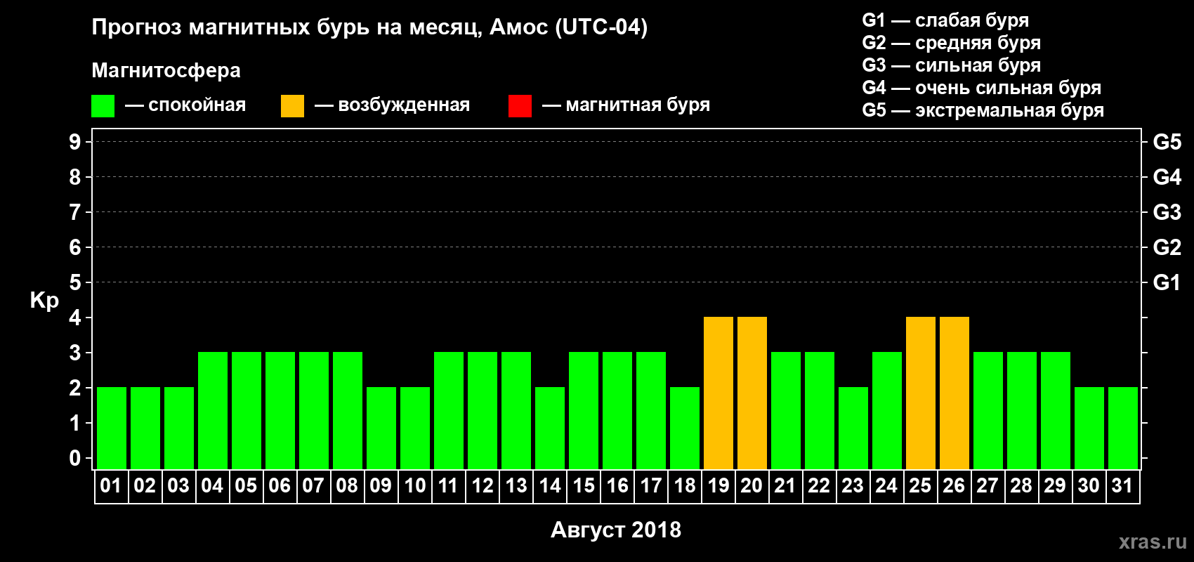 Прогноз магнитных бурь в Амосе на 1 августа 2018 года
