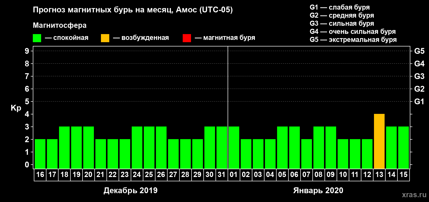 Прогноз магнитных бурь в Амосе на 16 декабря 2019 года