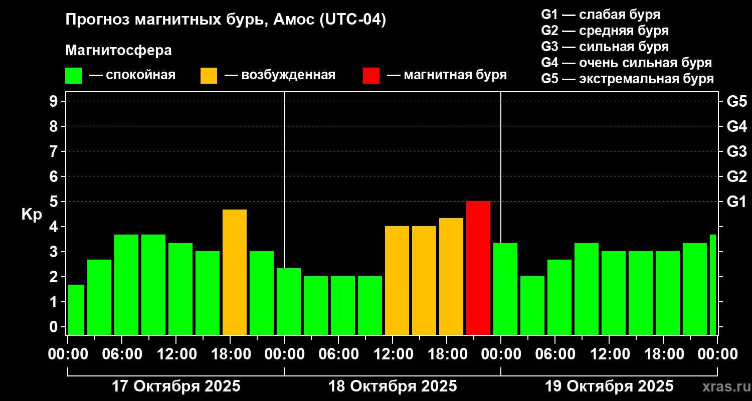 Прогноз магнитных бурь в Амосе на 17 октября 2025 года