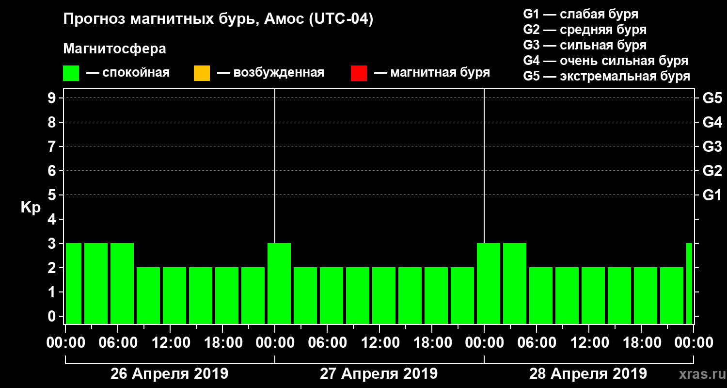 Прогноз магнитных бурь в Амосе на 26 апреля 2019 года