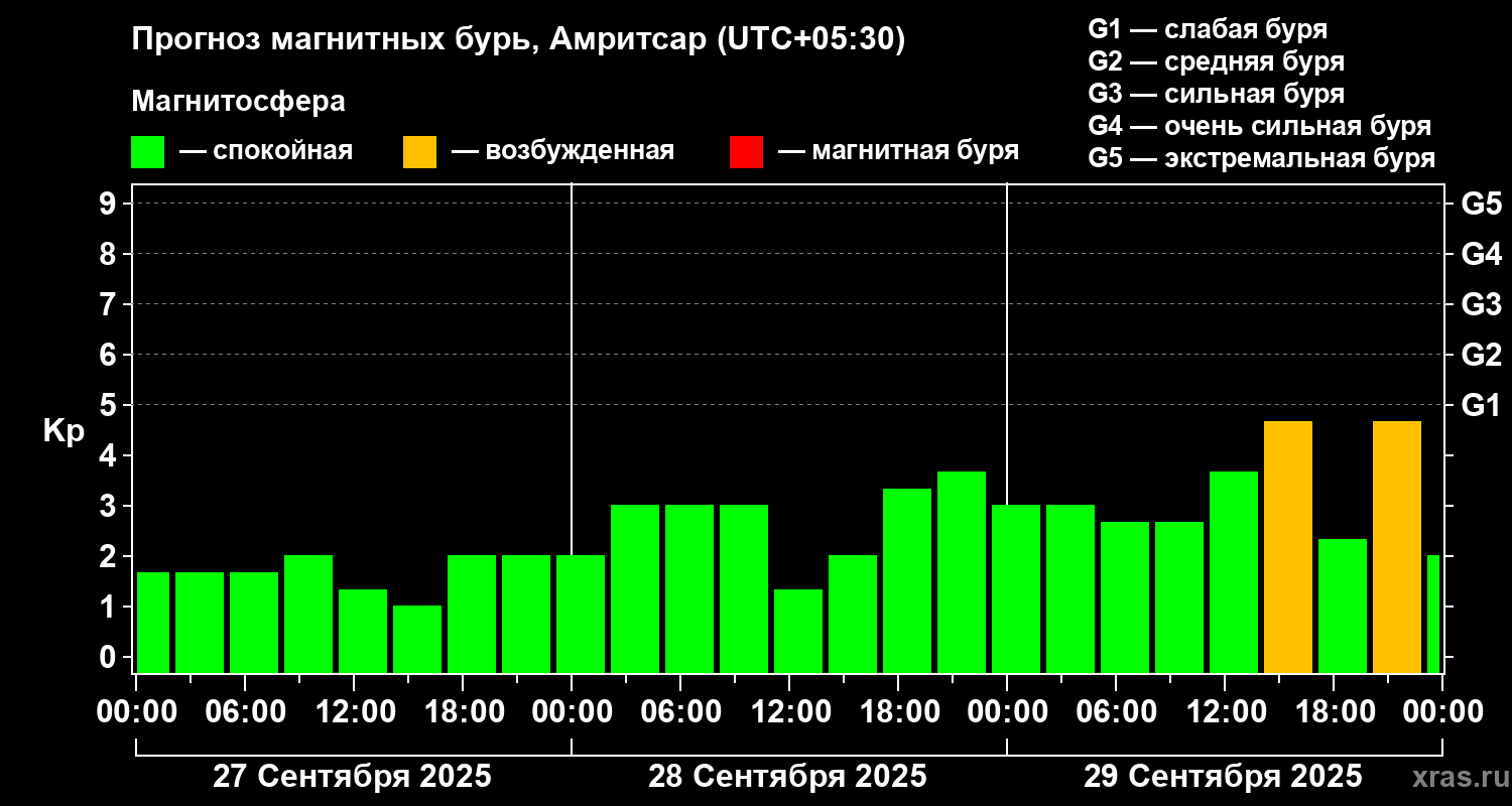 Прогноз магнитных бурь в Амритсаре — 27 сентября 2025 года
