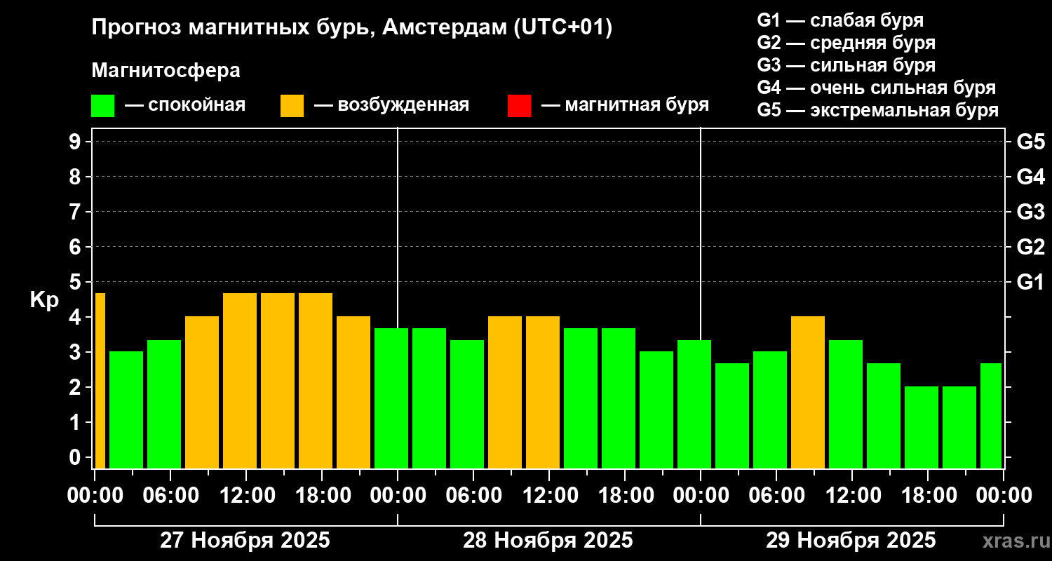 Прогноз магнитных бурь в Амстердаме на 27 ноября 2025 года