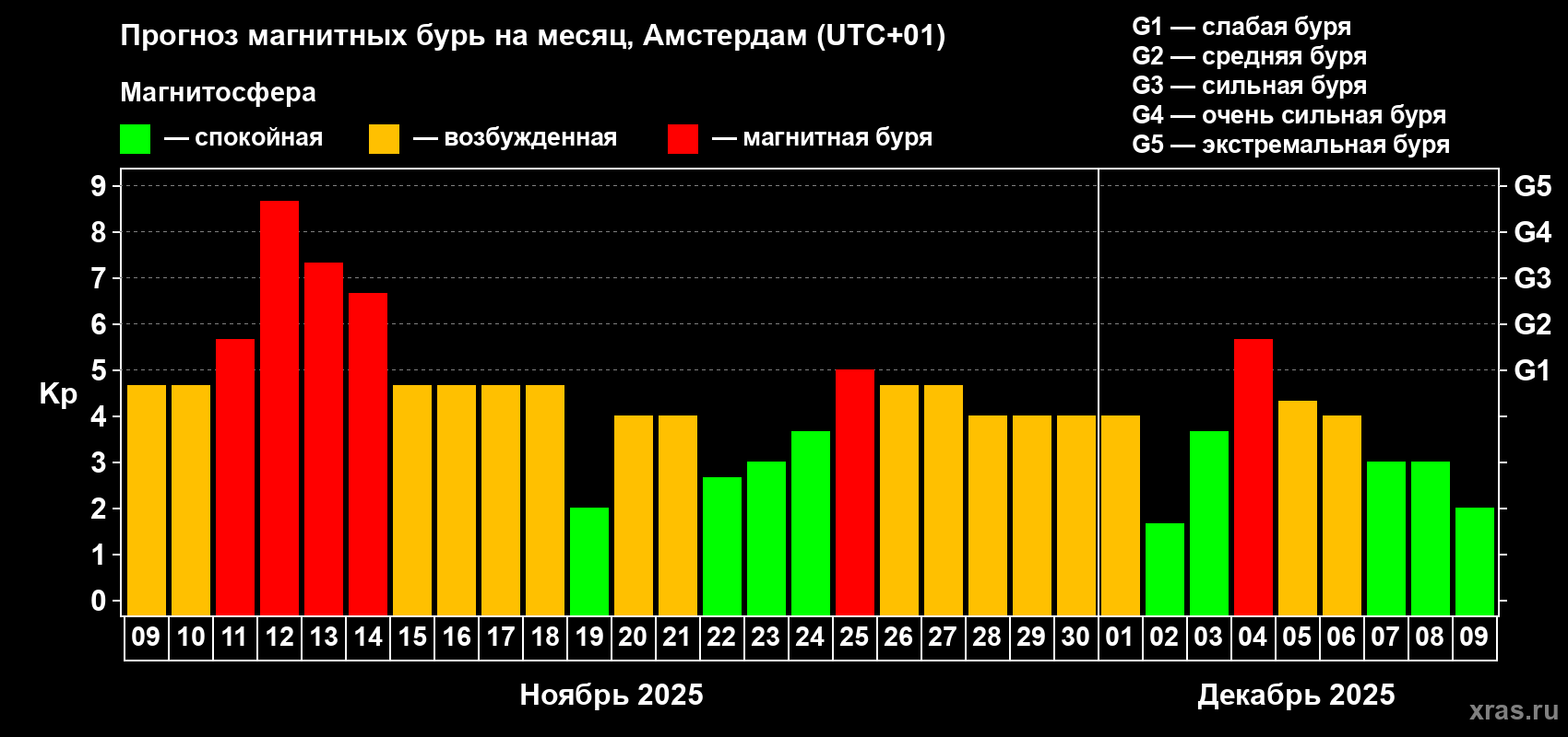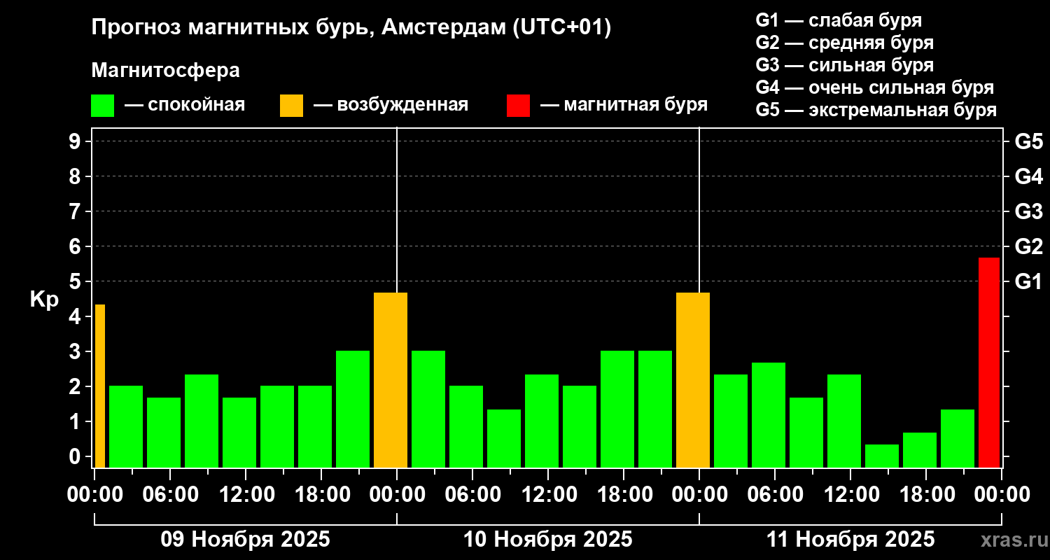 Прогноз магнитных бурь в Амстердаме на 9 ноября 2025 года