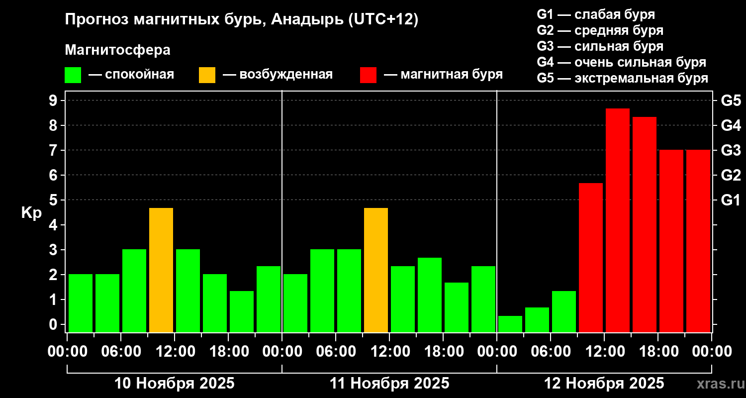 Прогноз магнитных бурь в Анадыре — 10 ноября 2025 года