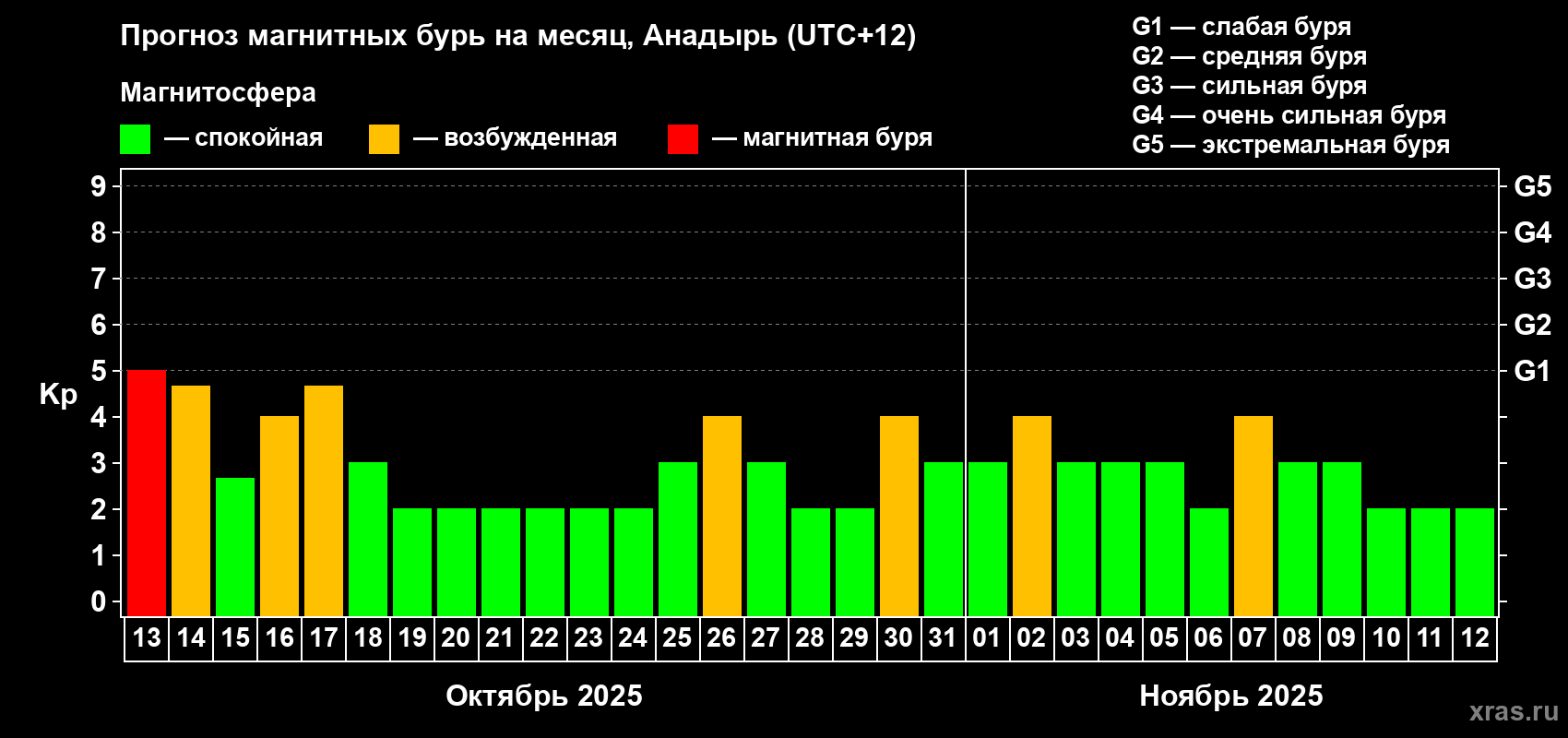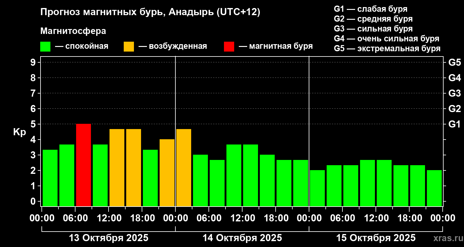 Прогноз магнитных бурь в Анадыре — 13 октября 2025 года