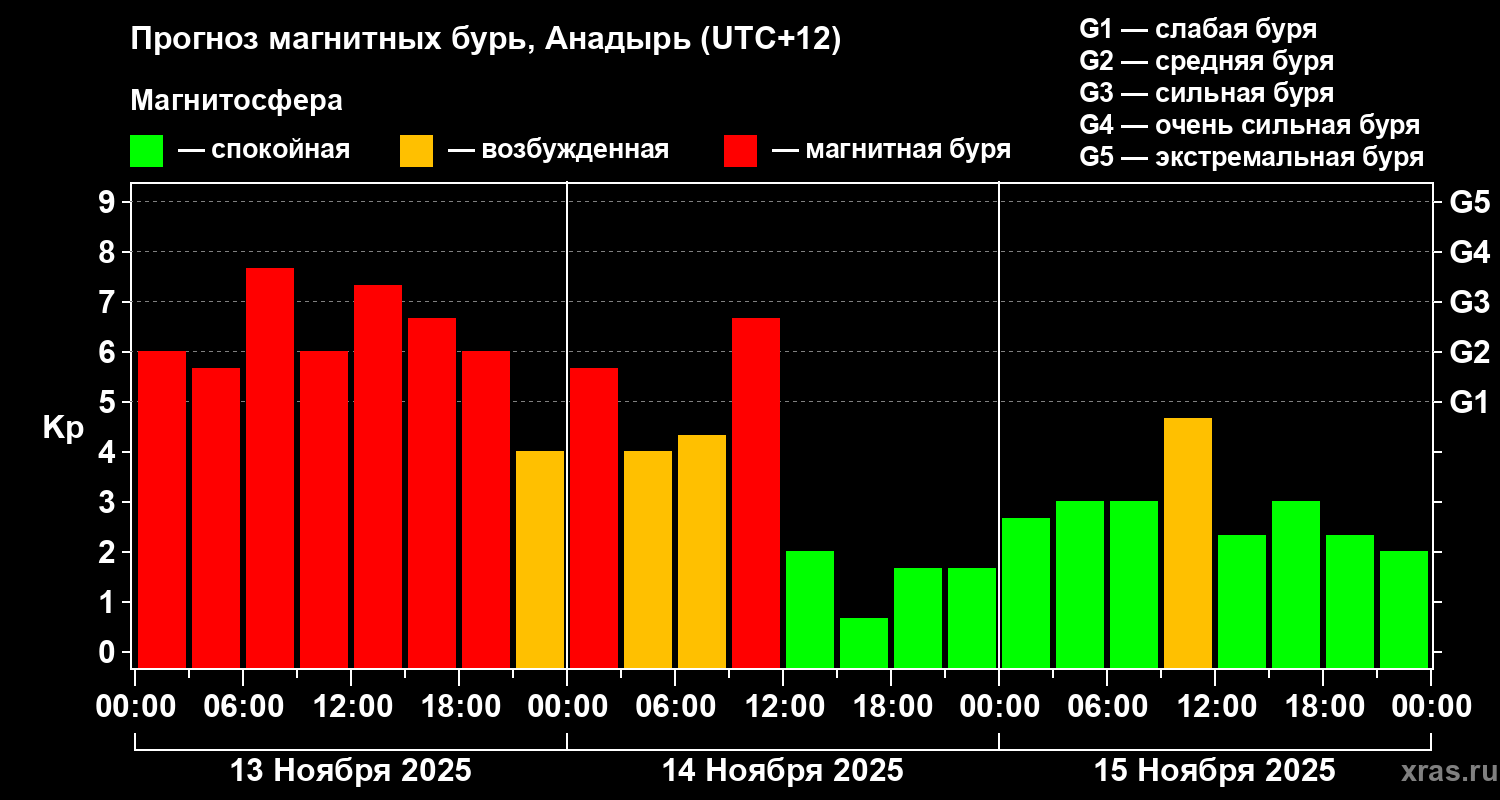Прогноз магнитных бурь в Анадыре — 13 ноября 2025 года