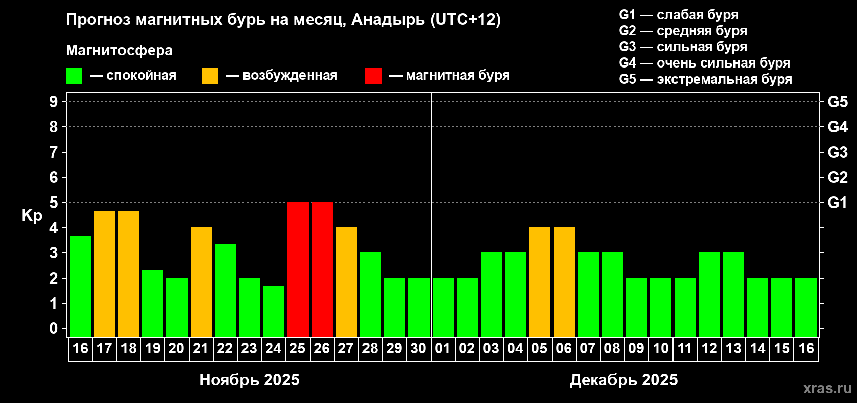 Прогноз магнитных бурь в Анадыре на 16 ноября 2025 года