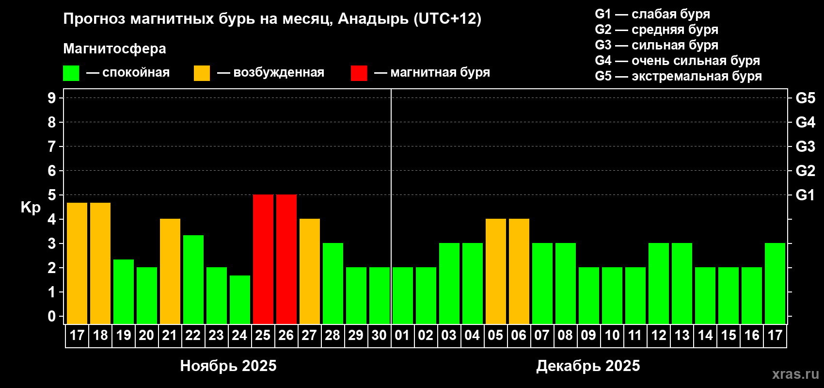 Прогноз магнитных бурь в Анадыре — 17 ноября 2025 года