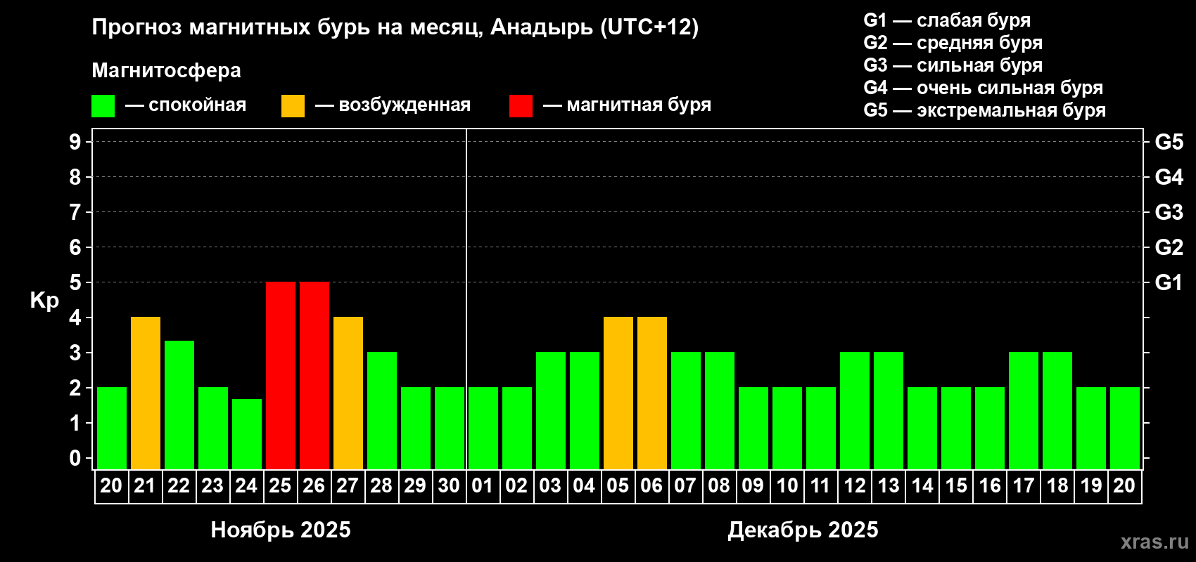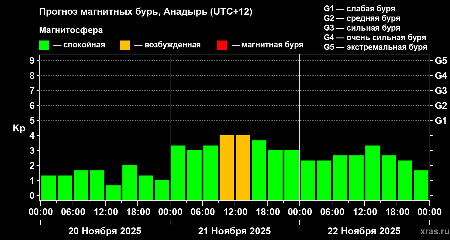 Прогноз магнитных бурь в Анадыре — 20 ноября 2025 года