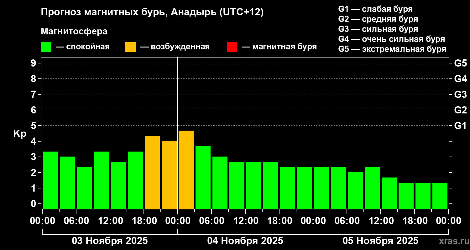 Прогноз магнитных бурь в Анадыре — 3 ноября 2025 года