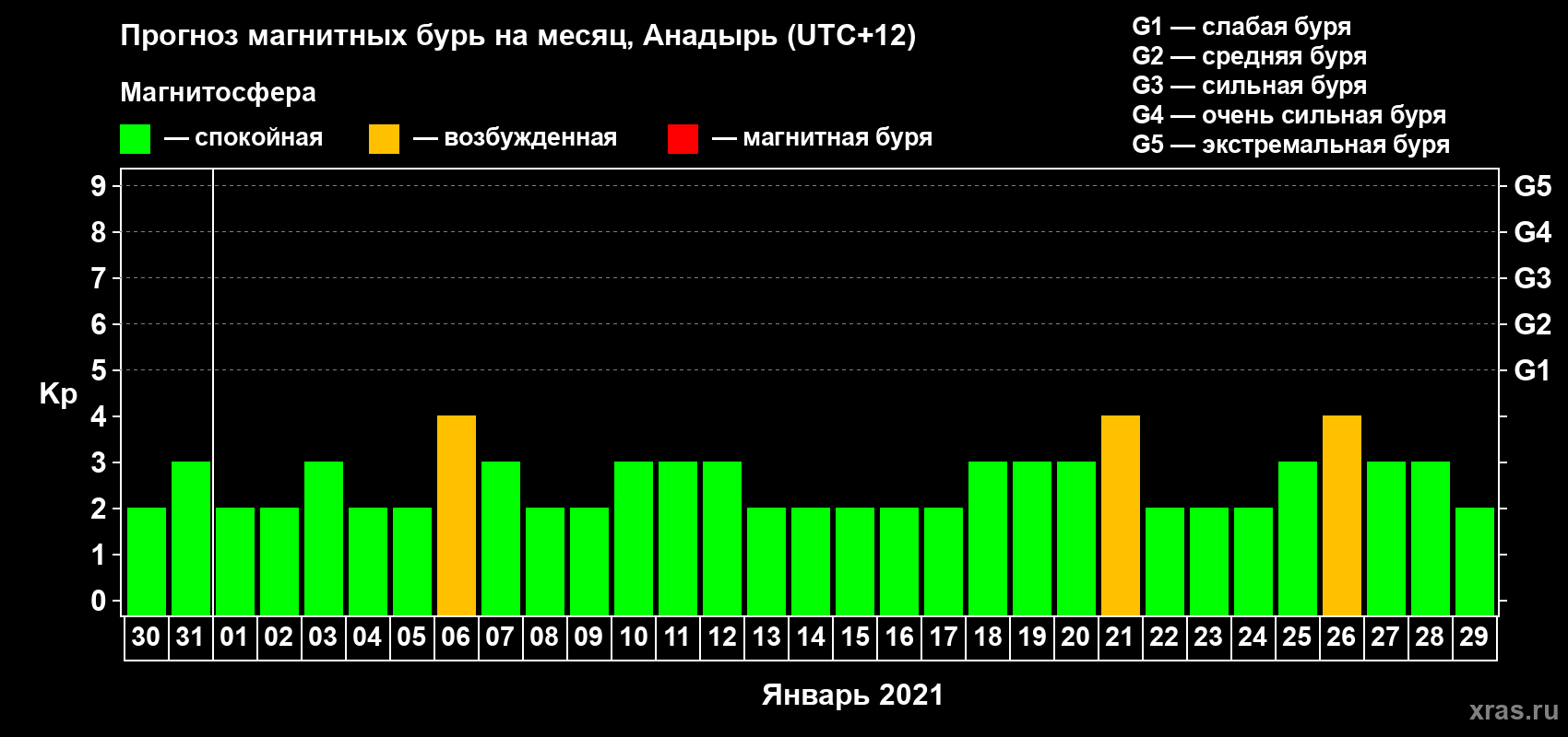 Прогноз магнитных бурь в Анадыре — 30 декабря 2020 года