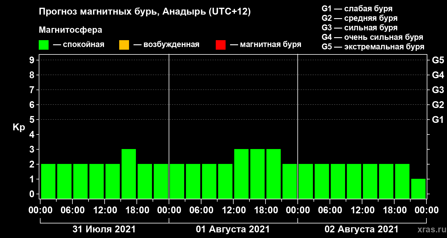 Прогноз магнитных бурь в Анадыре на 31 июля 2021 года