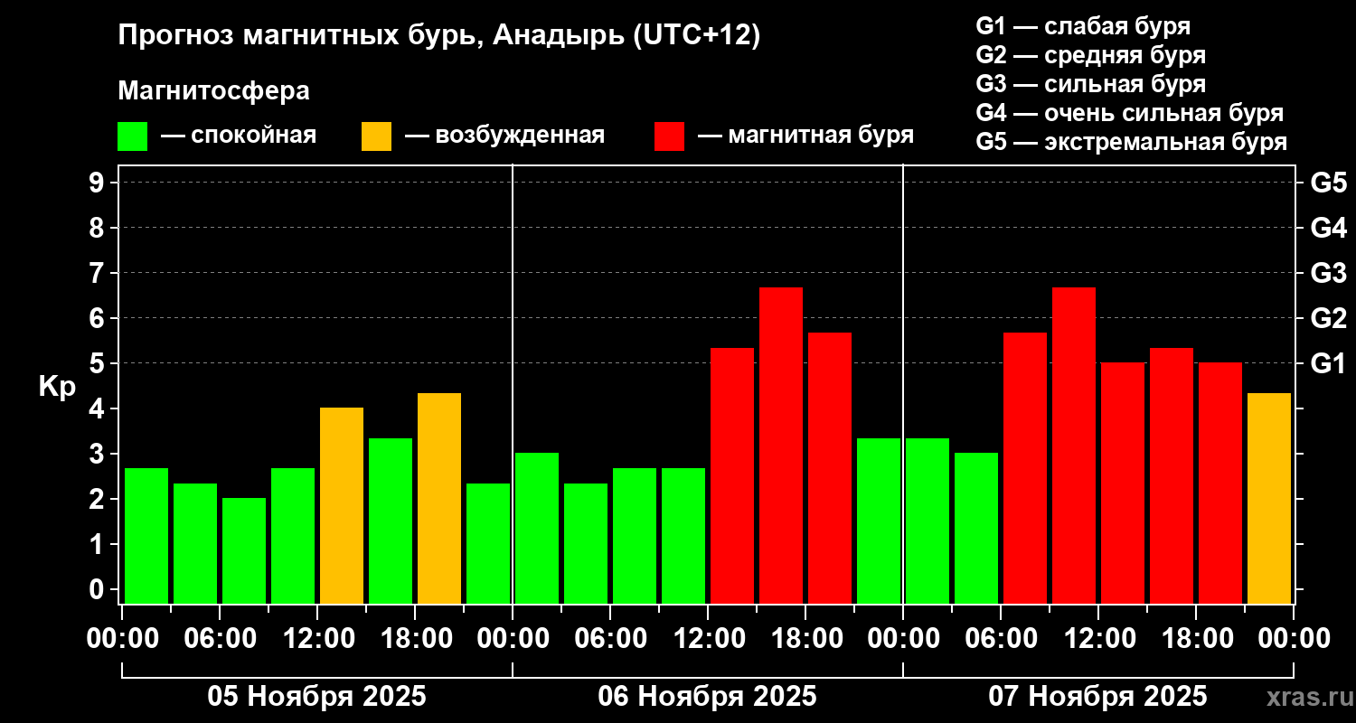 Прогноз магнитных бурь в Анадыре — 5 ноября 2025 года