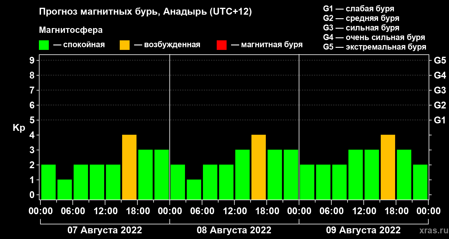 Прогноз магнитных бурь в Анадыре на 7 августа 2022 года
