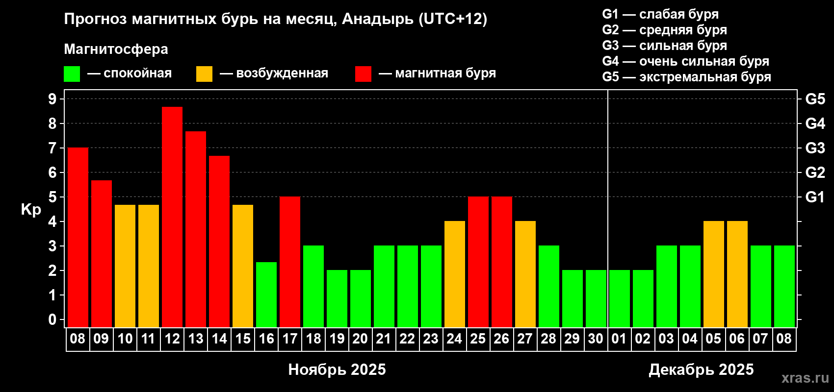 Прогноз магнитных бурь в Анадыре — 8 ноября 2025 года