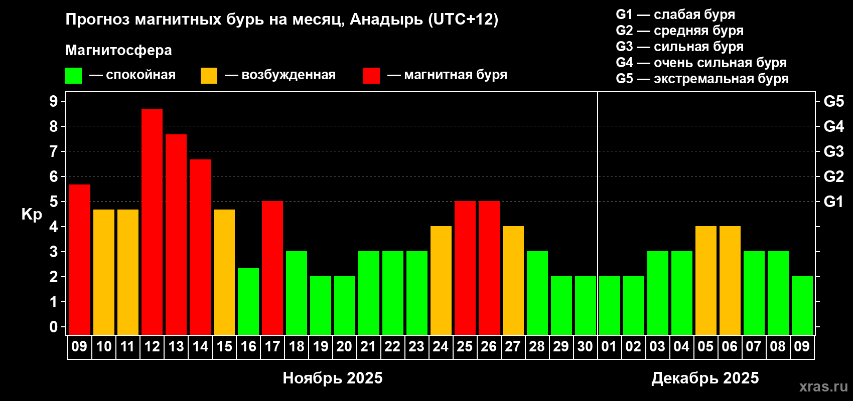 Прогноз магнитных бурь в Анадыре — 9 ноября 2025 года