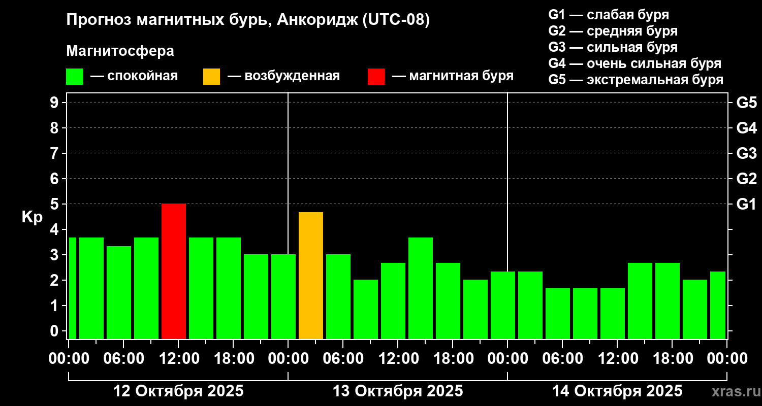 Прогноз магнитных бурь в Анкоридже — 12 октября 2025 года