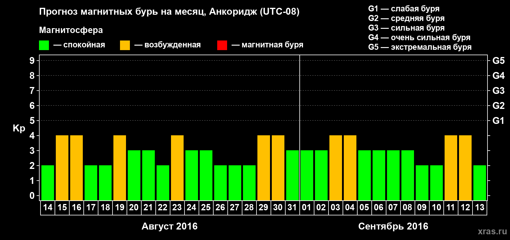 Прогноз магнитных бурь в Анкоридже — 14 августа 2016 года