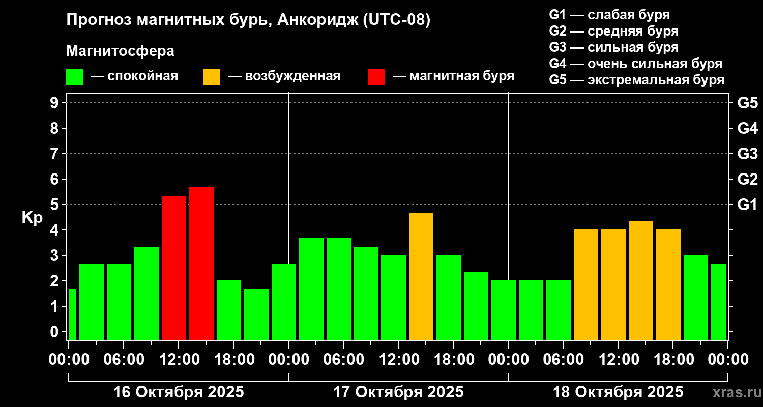 Прогноз магнитных бурь в Анкоридже — 16 октября 2025 года