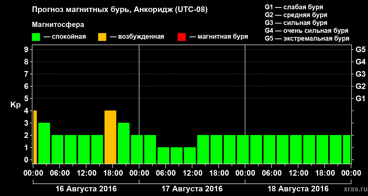 Прогноз магнитных бурь в Анкоридже — 16 августа 2016 года