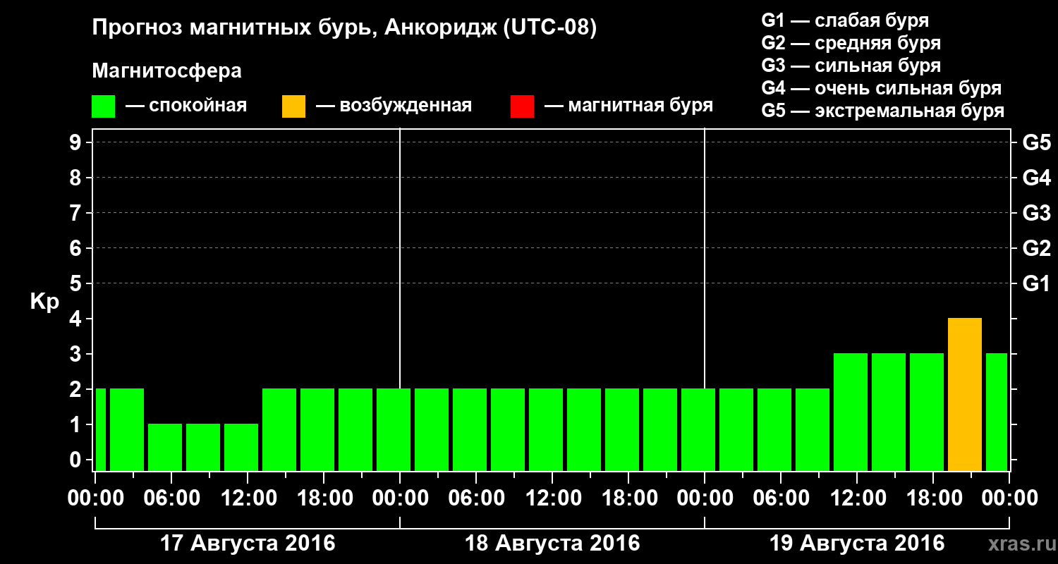 Прогноз магнитных бурь в Анкоридже — 17 августа 2016 года