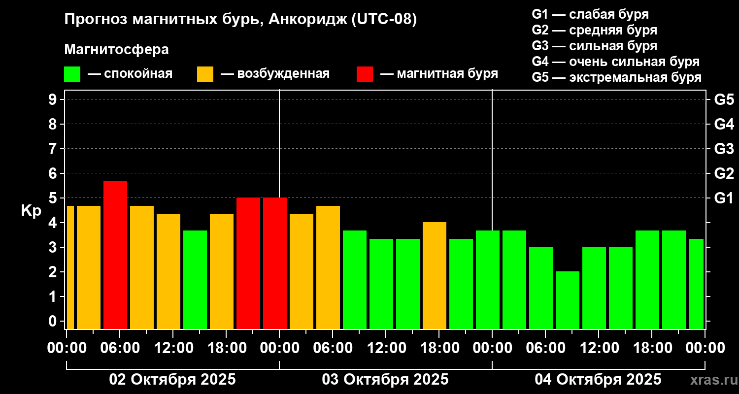 Прогноз магнитных бурь в Анкоридже — 2 октября 2025 года