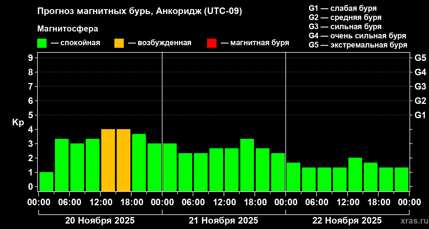 Прогноз магнитных бурь в Анкоридже — 20 ноября 2025 года