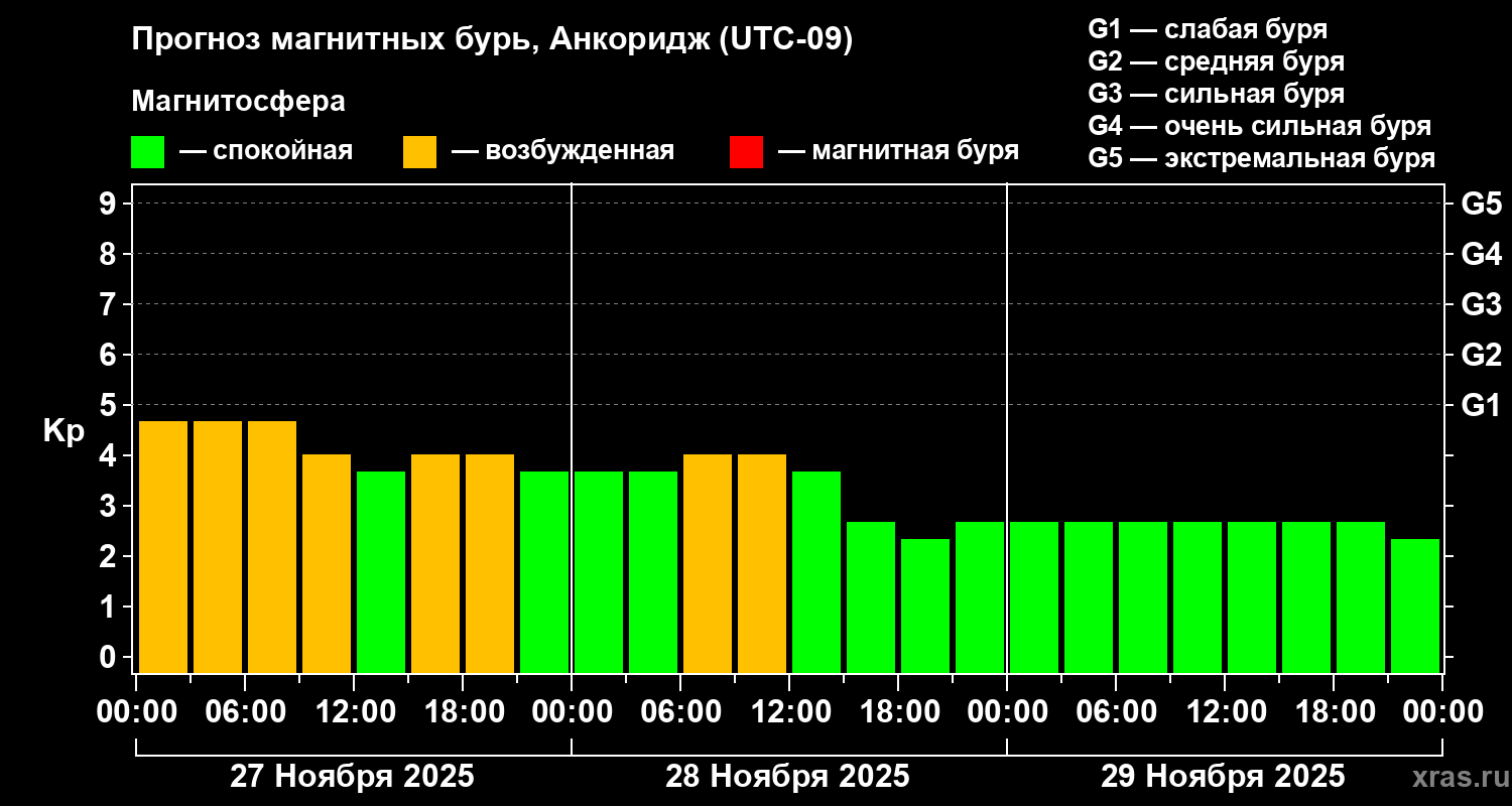 Прогноз магнитных бурь в Анкоридже на 27 ноября 2025 года
