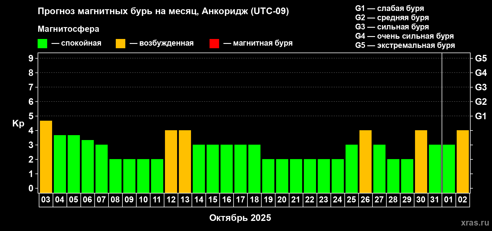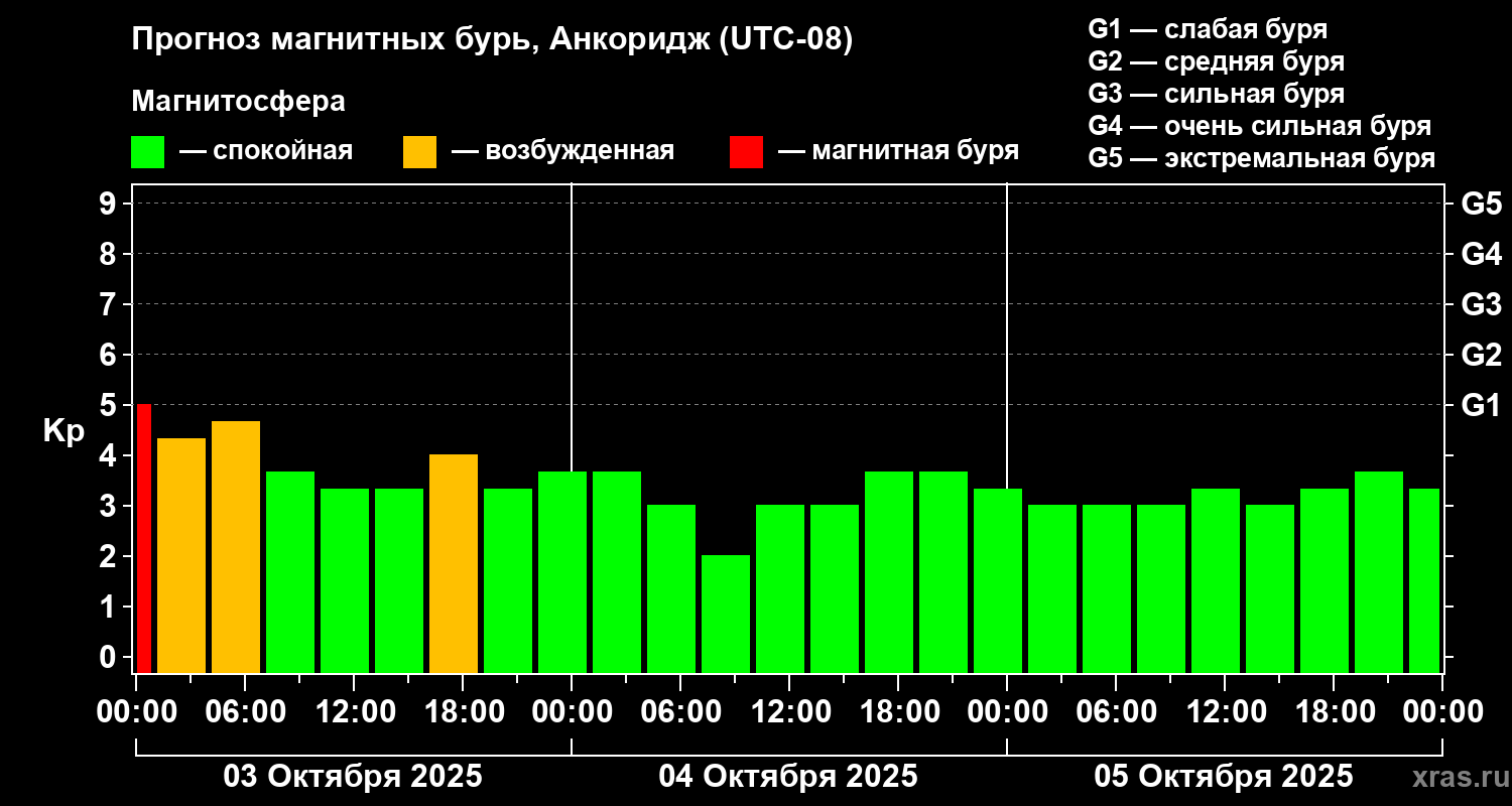 Прогноз магнитных бурь в Анкоридже — 3 октября 2025 года
