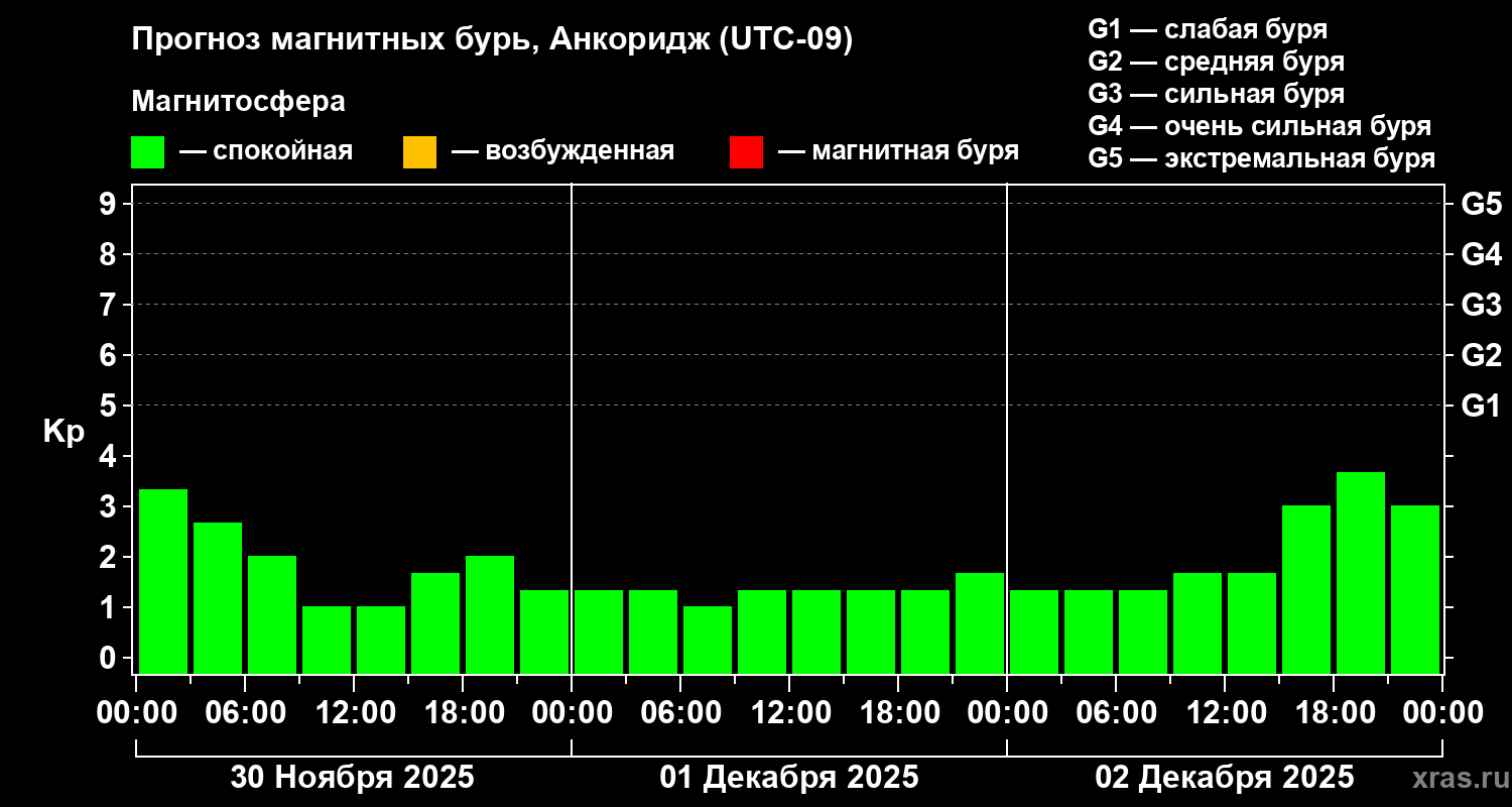 Прогноз магнитных бурь в Анкоридже — 30 ноября 2025 года