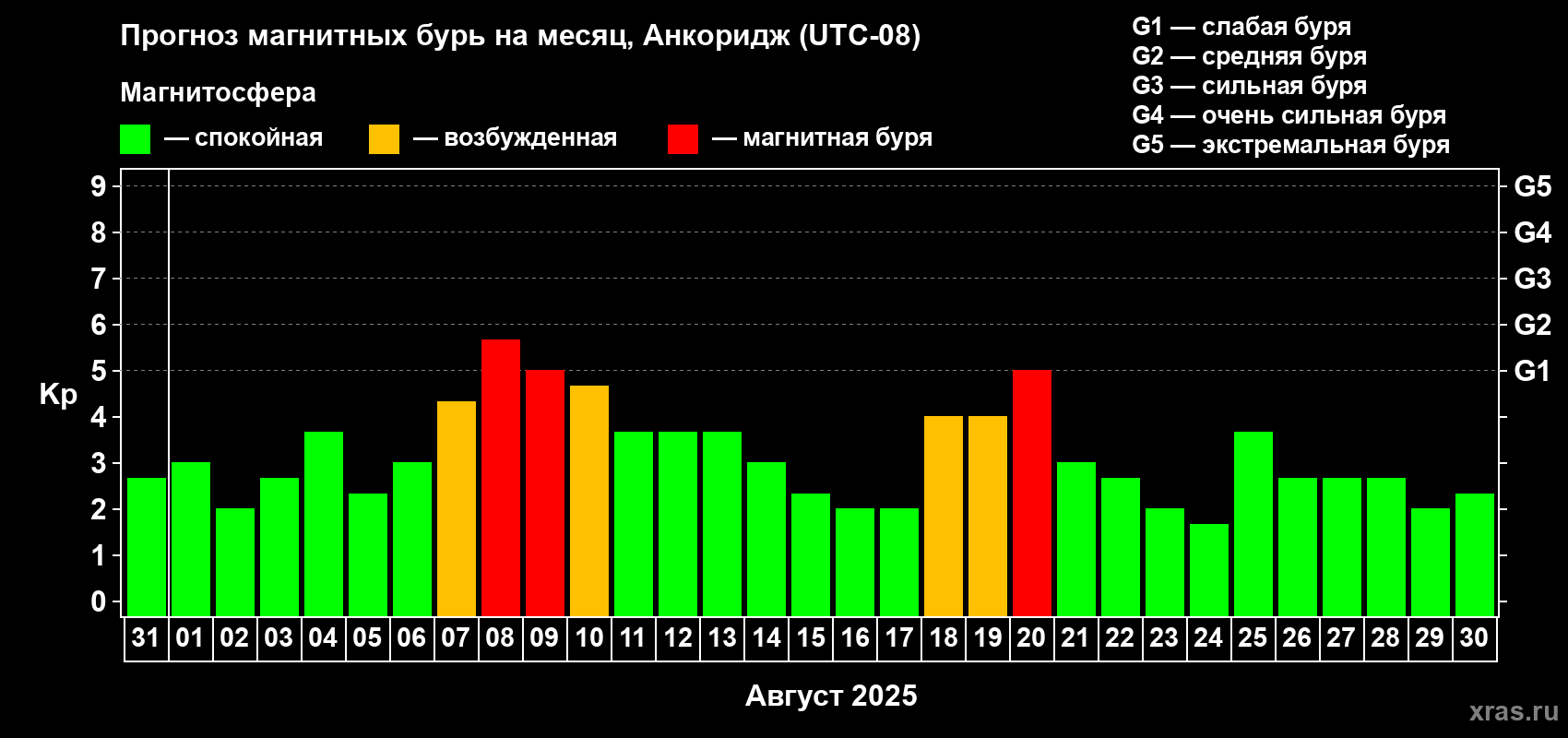 Прогноз магнитных бурь в Анкоридже — 31 июля 2025 года