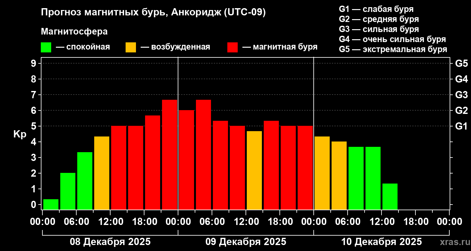Прогноз магнитных бурь в Анкоридже на 8 декабря 2025 года