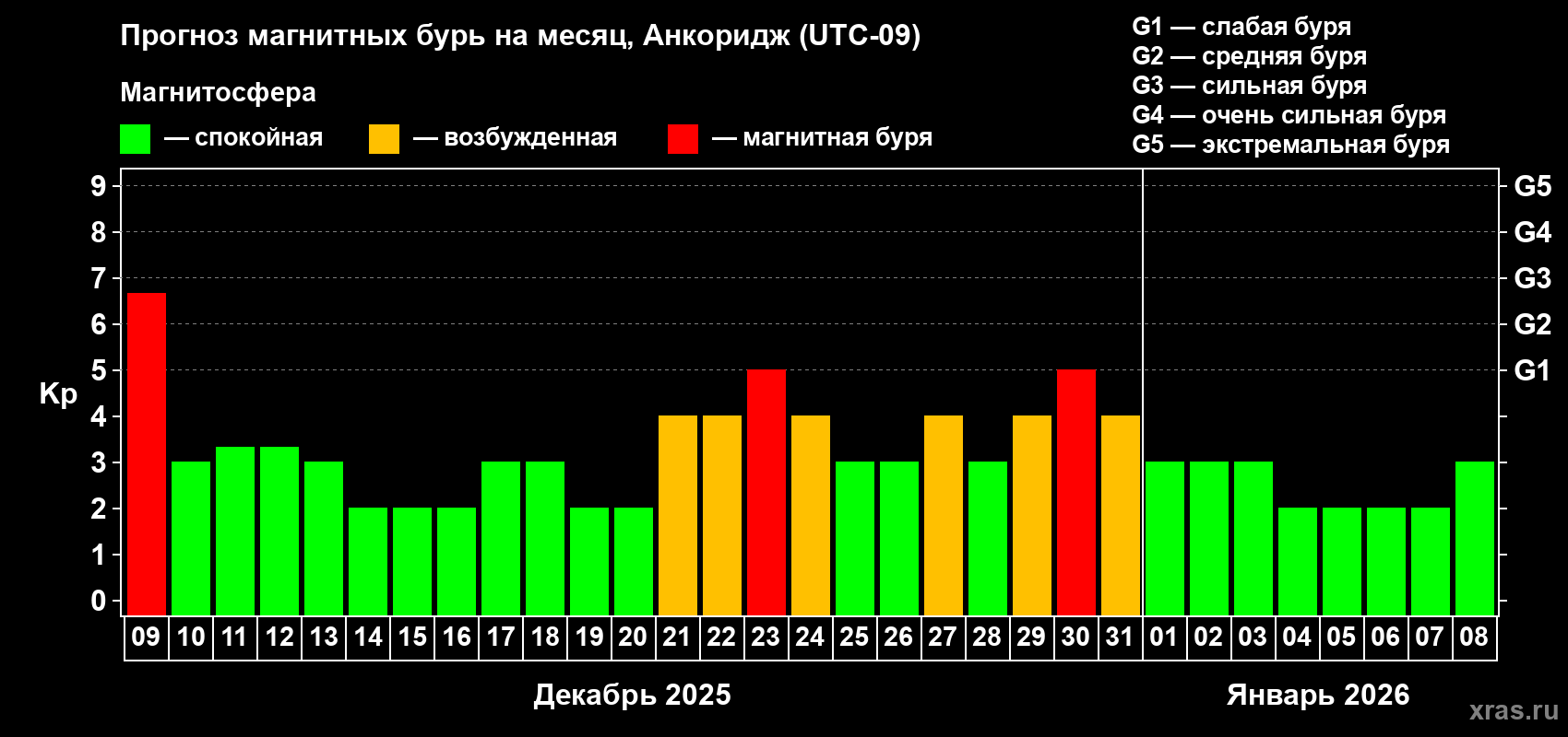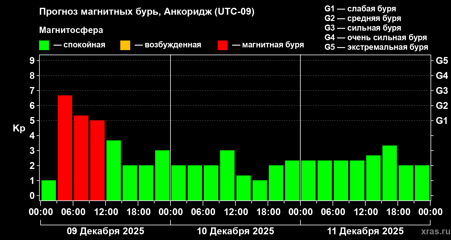 Прогноз магнитных бурь в Анкоридже — 9 декабря 2025 года