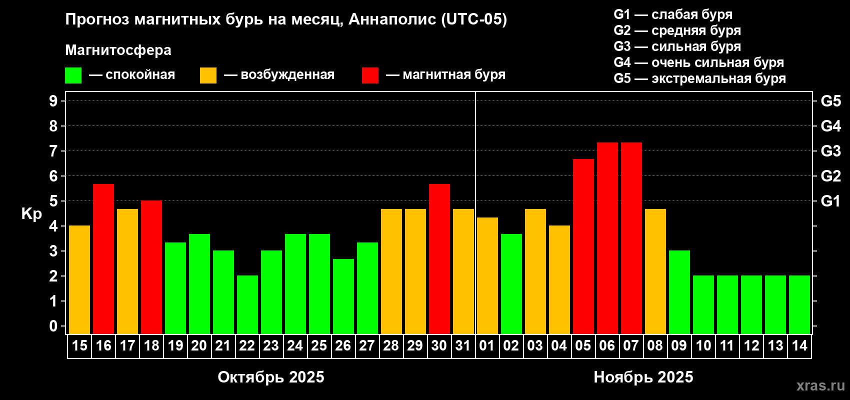 Прогноз магнитных бурь в Аннаполисе — 15 октября 2025 года