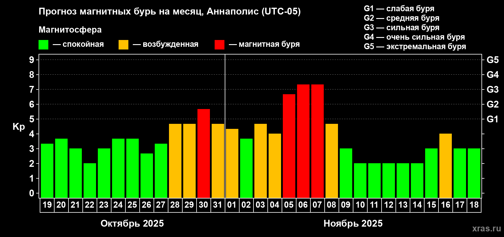 Прогноз магнитных бурь в Аннаполисе — 19 октября 2025 года