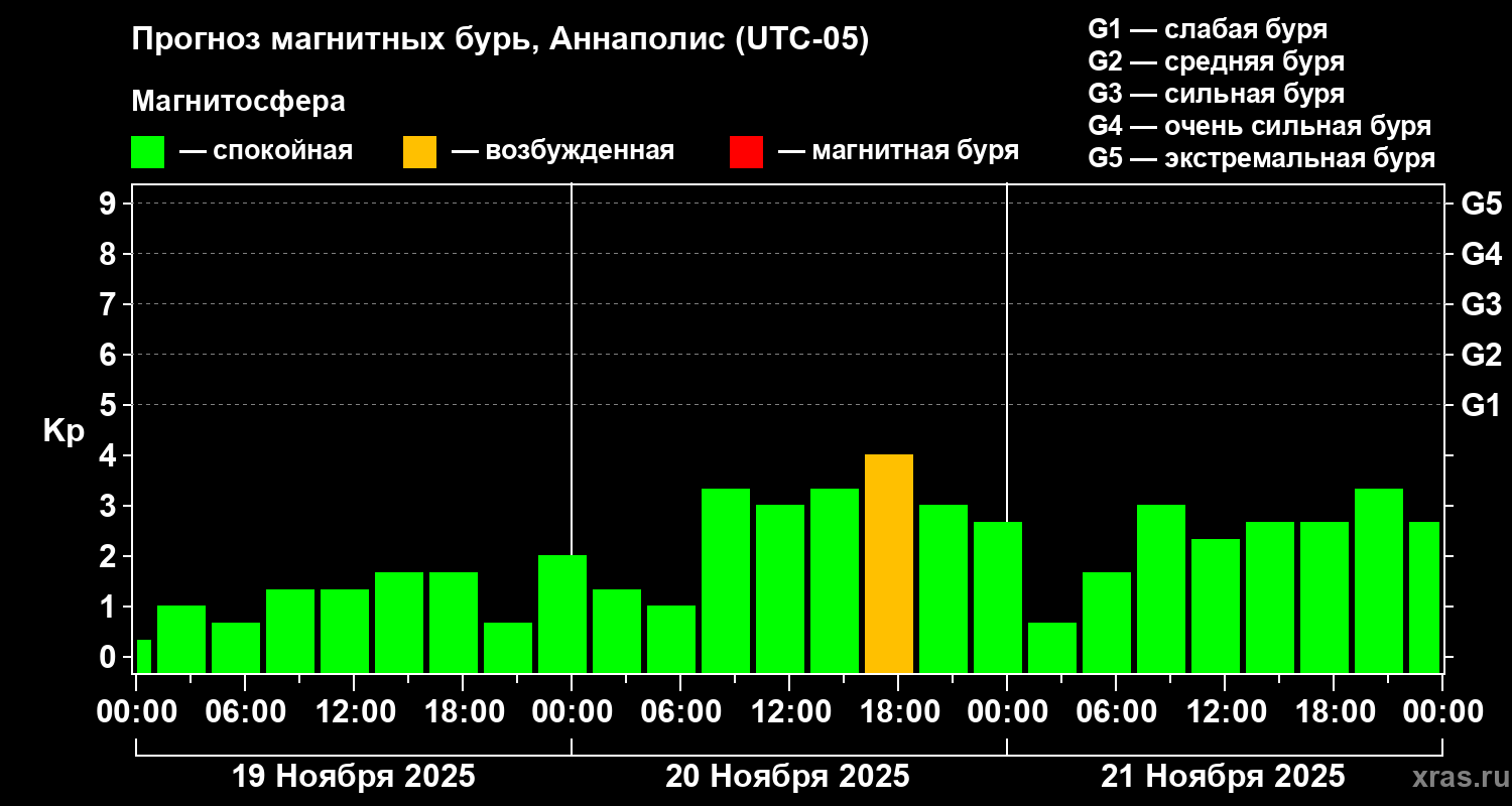 Прогноз магнитных бурь в Аннаполисе на 19 ноября 2025 года