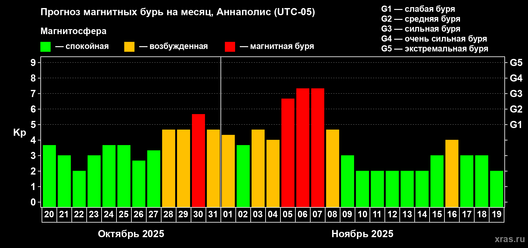Прогноз магнитных бурь в Аннаполисе — 20 октября 2025 года