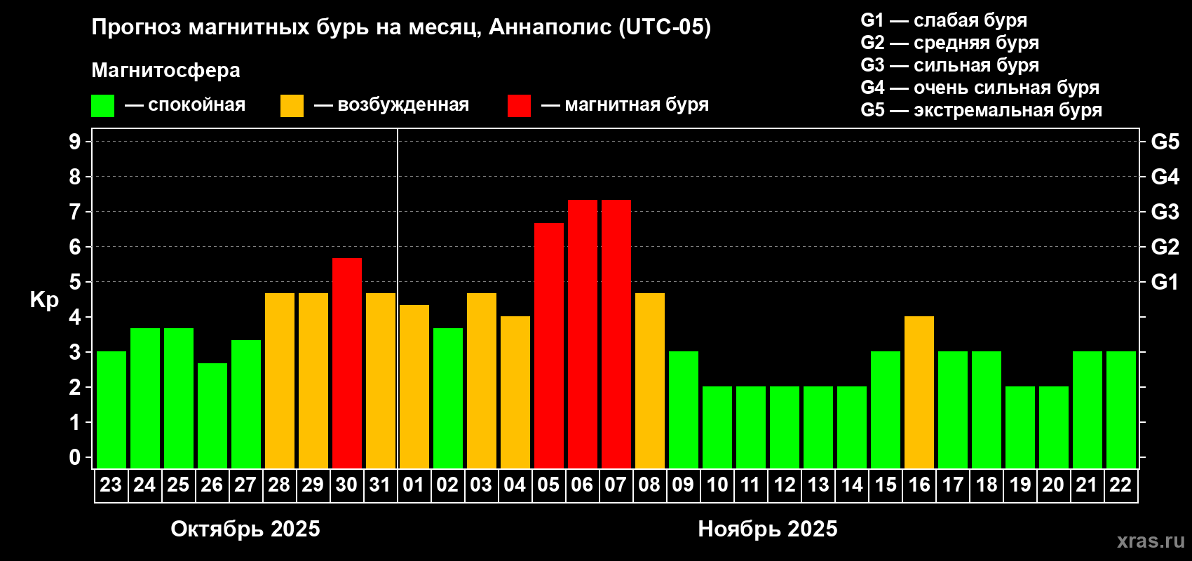 Прогноз магнитных бурь в Аннаполисе — 23 октября 2025 года