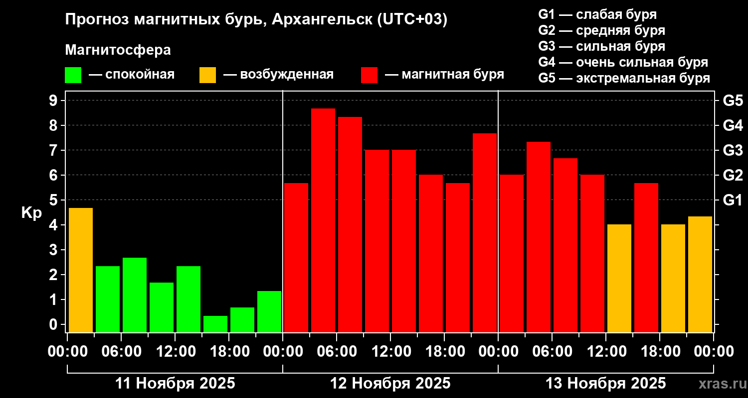 Прогноз магнитных бурь в Архангельске — 11 ноября 2025 года