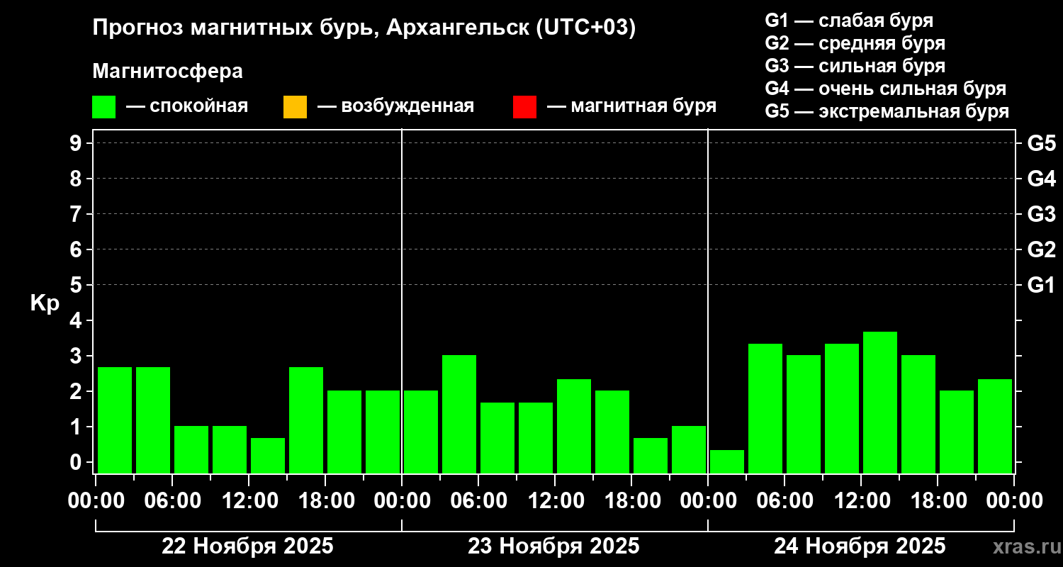 Прогноз магнитных бурь в Архангельске — 22 ноября 2025 года
