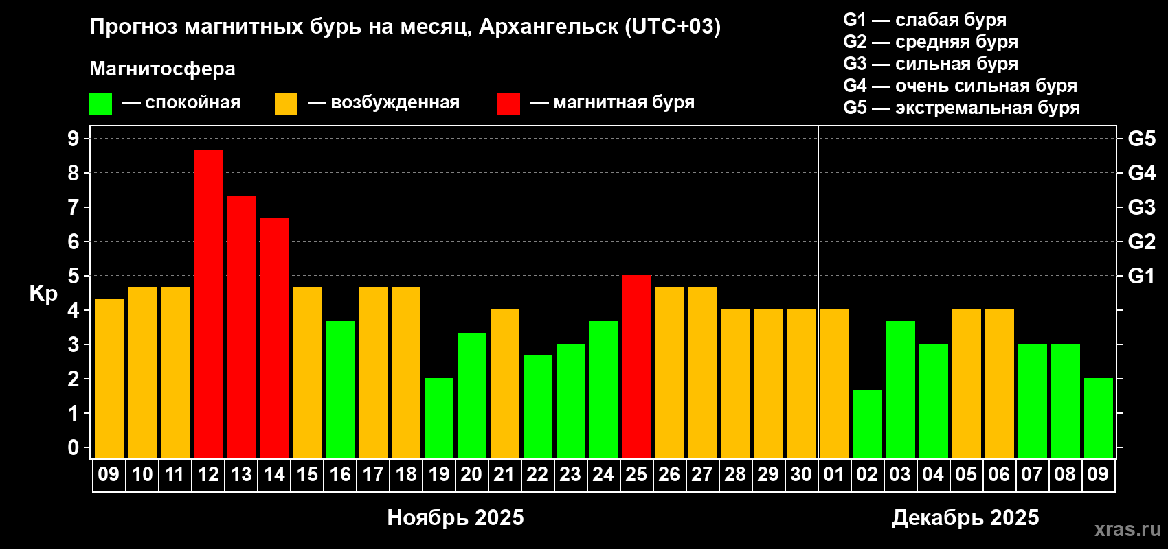 Прогноз магнитных бурь в Архангельске — 9 ноября 2025 года