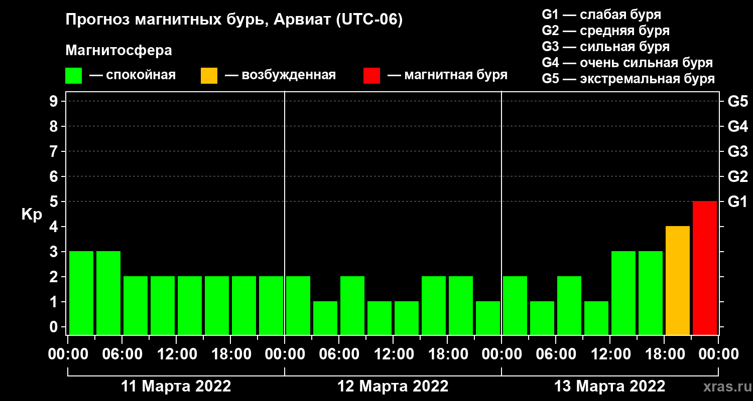 Прогноз магнитных бурь в Арвиате — 11 марта 2022 года