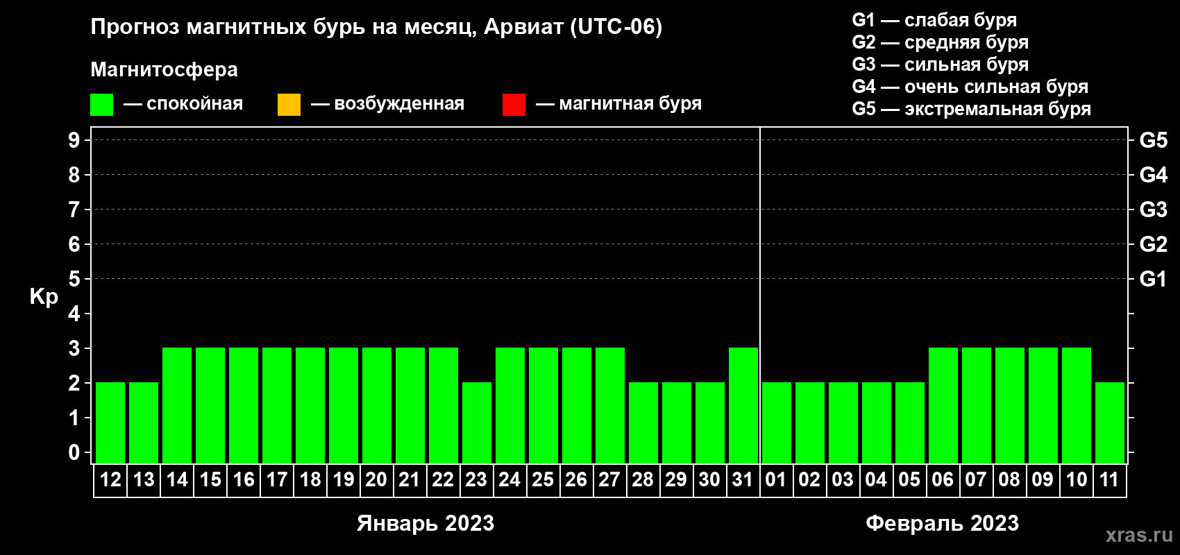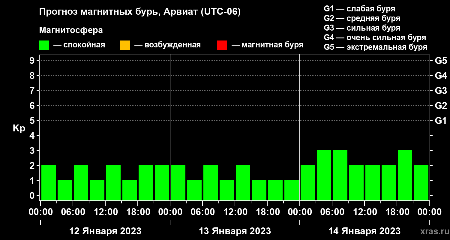 Прогноз магнитных бурь в Арвиате — 12 января 2023 года