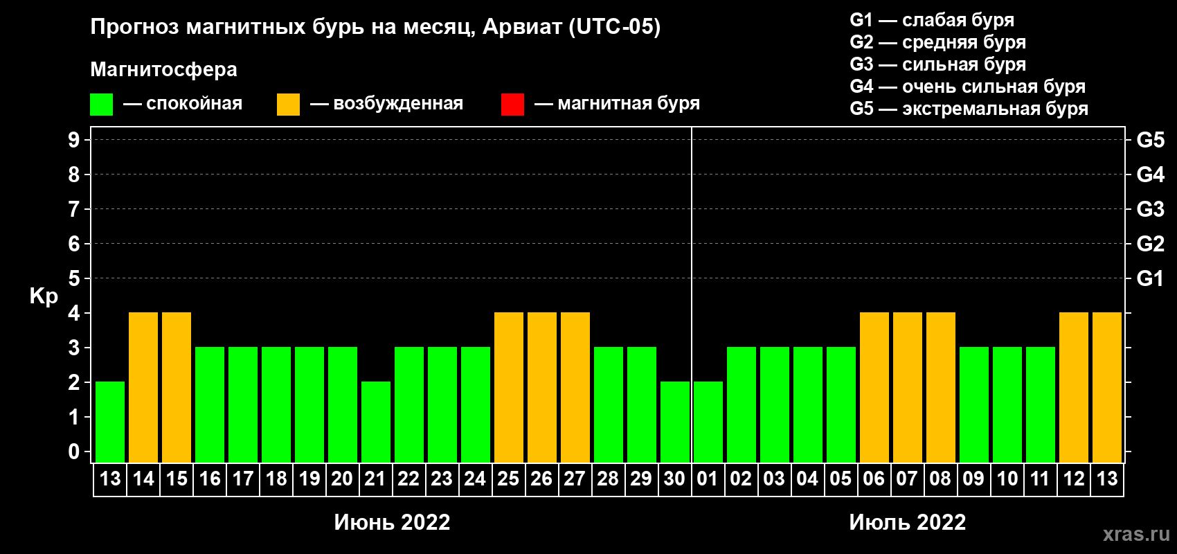 Прогноз магнитных бурь в Арвиате — 13 июня 2022 года