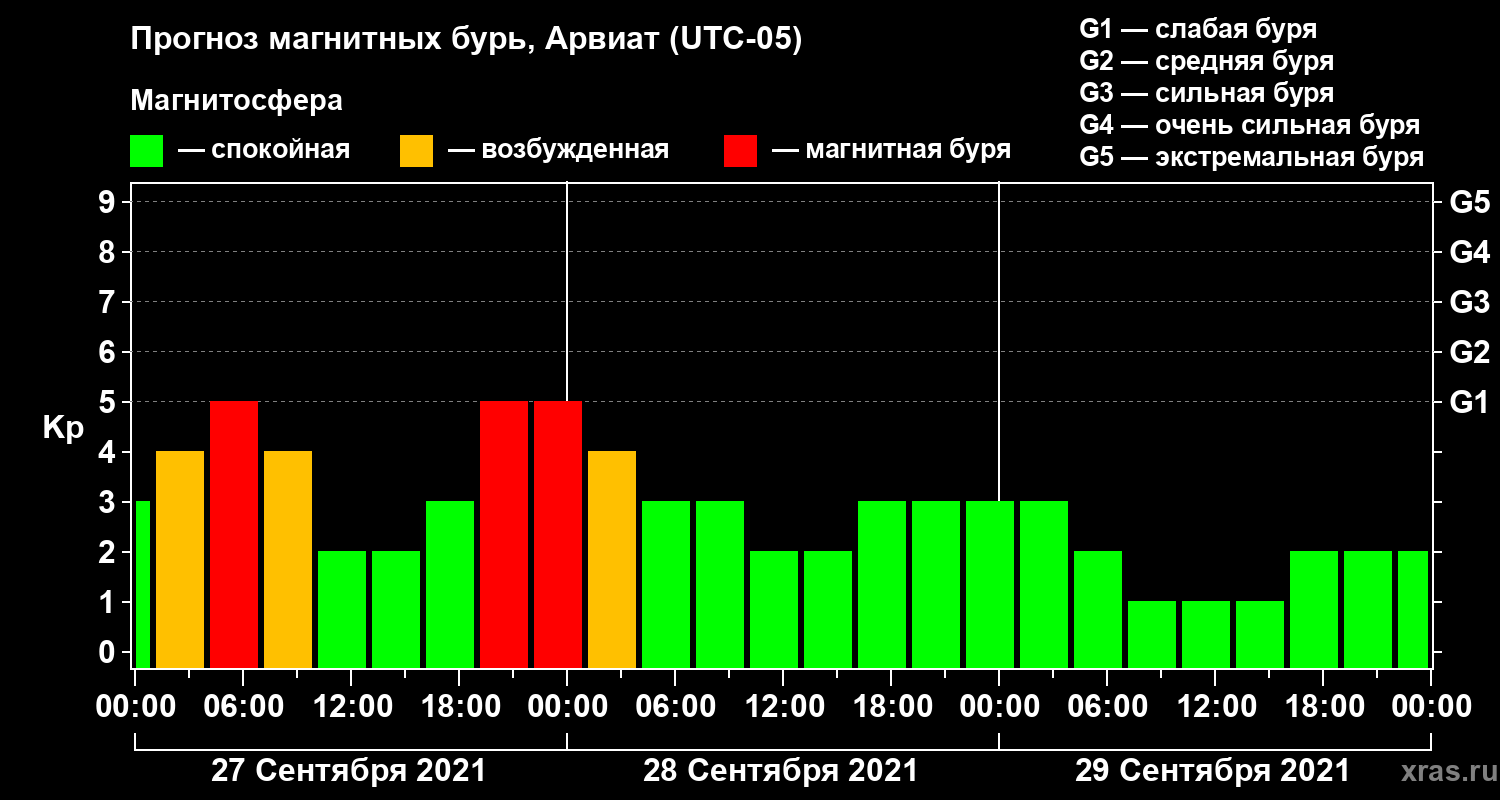 Прогноз магнитных бурь в Арвиате — 27 сентября 2021 года