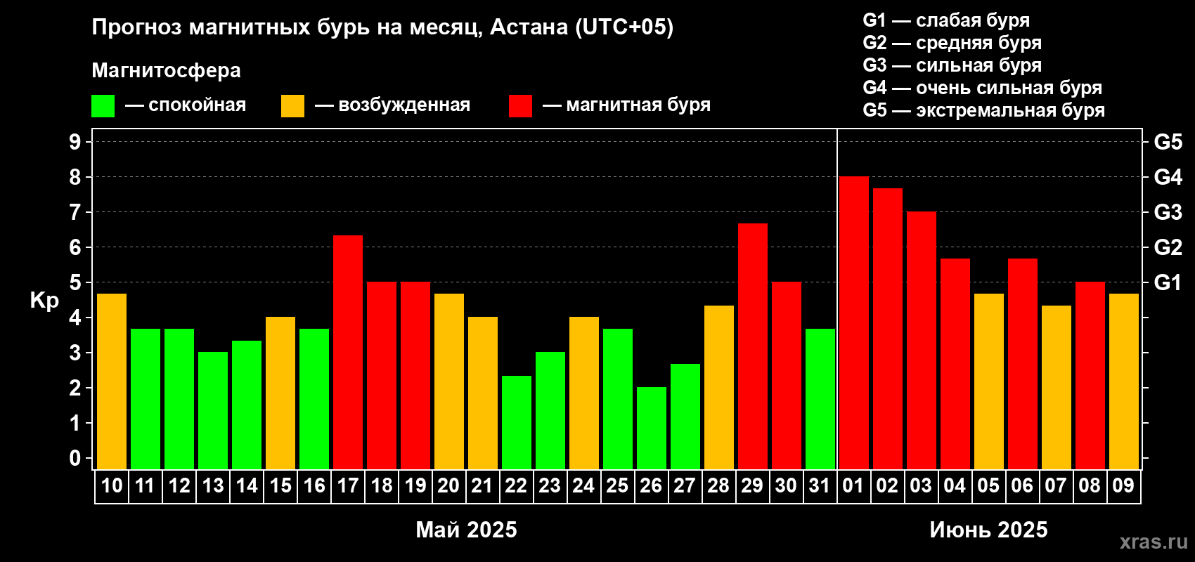 Прогноз магнитных бурь в Астане — 10 мая 2025 года