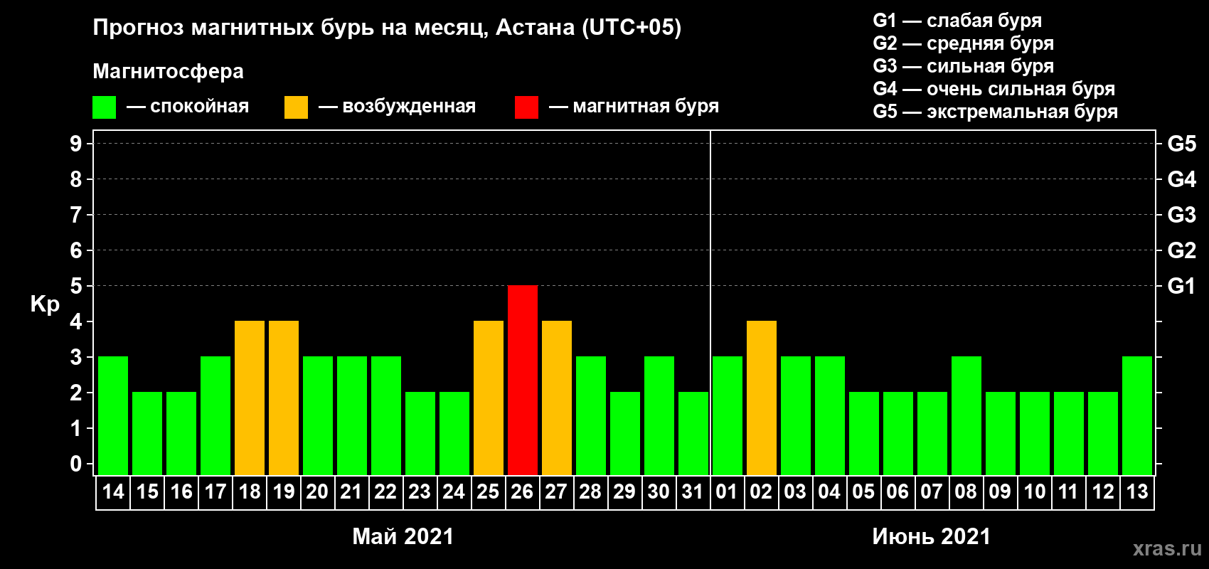 Прогноз магнитных бурь в Астане — 14 мая 2021 года